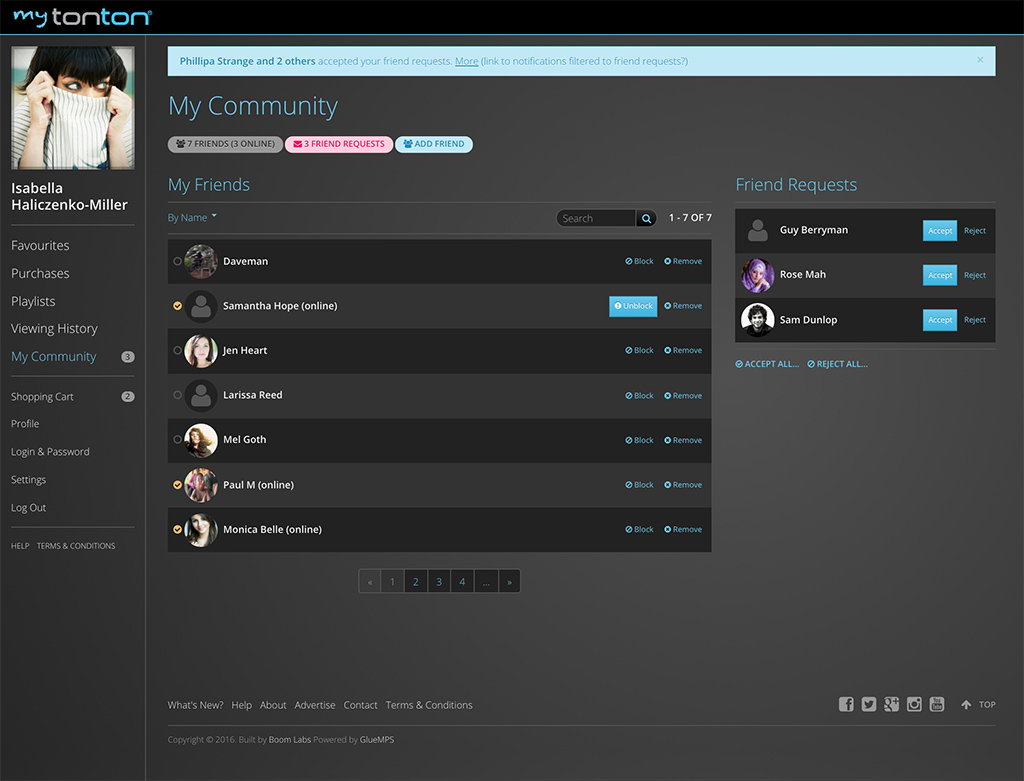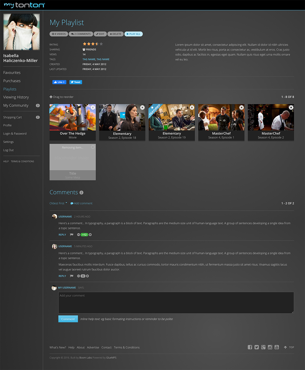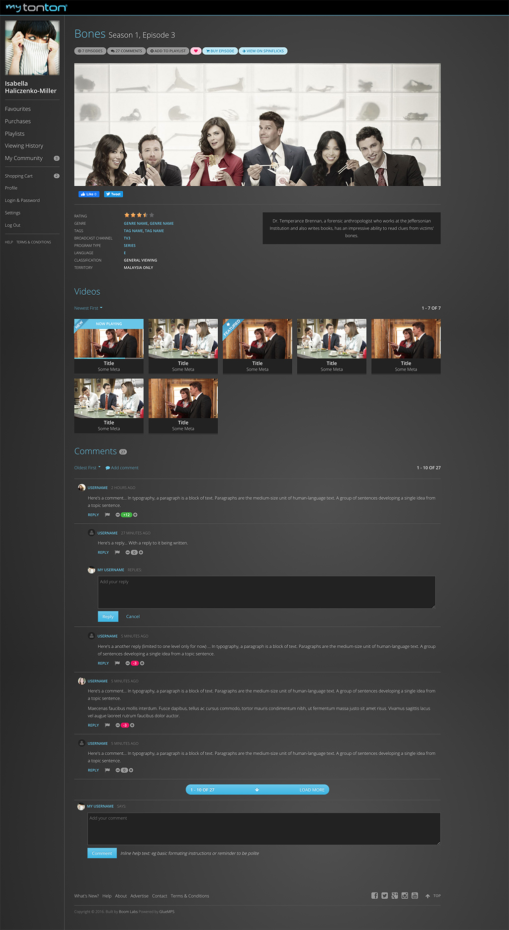 Audience engagement is achieved through a combination of good content and user experience. Glue masters user experience with personalized user interactions that increase both content and community engagement premised on an understanding that humans seek shared entertainment experiences. Glue builds community around a suite of features including user dashboards, playlists, ratings, comments, chat, favourites, follow friends, notifications and event-based content publishing. Personalized content recommendations and content relationships drive audience engagement via device and in-app notifications.